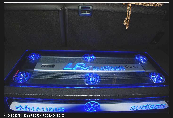 安装好的欧迪臣功放与低音,再配上亚克力与灯光的陪衬下显得活灵活现。