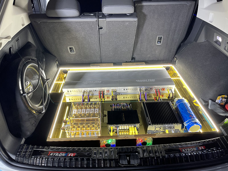 接下来就是尾箱工艺了。这里的设计和喇叭的安装不同,由于超低音、功放、解码器、电容等音响器材的集合,合理的放置显得尤为重要,同时将对称、透明、线条、灯光等一系列设计元素融合为一体,形成一个整体的构造,既要尽量节省空间,又要显得逼格满满,真正做到高端大气上档次。