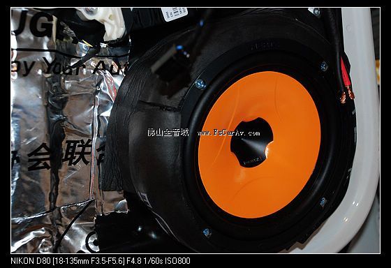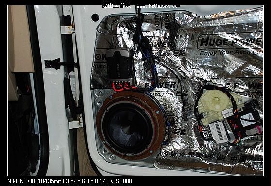 喇叭方面,前后声场都是采用低调的安装方法,如前声场的HSK165.4高音单元装于门板的三角位,中低音单元沿用原位安装。门板外饰还原,不是听,完全是感觉已是换装过喇叭的。后声场的ESK165.4喇叭也不例外。不过,值得我们注意的是,即使中低音装在原位,其都做了不少功夫,如加防水罩,喇叭周边密封等,一样不少。这些工艺,在原车音响是身上看不到的,也是区别于原车音响。