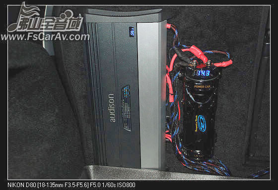 意大利欧迪臣功放,赫兹十二寸低音与电容整齐地放在后尾箱