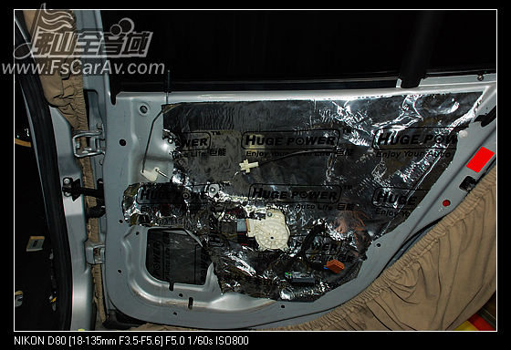 第一步:隔音部分。这是安装音响的第一环,用的材料也很讲究的,一定要用丁基橡胶,不能用那些什么沥青。做工的时候必须把隔音贴好,压紧。